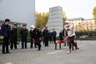 保衛(wèi)部微型消防站隊員需完成原地著消防防護服、佩戴自救呼吸器30米滅火、一人兩盤水帶連接操。原地著防護服,隊員在聽到“開始”口令后迅速穿戴防護服、消防靴、消防頭盔、扎安全腰帶。佩戴自救呼吸器,在起點處完成空氣呼吸器的佩戴,隨即提起4kg干粉滅火器快速到達距離30米處的指定區(qū)域進行滅火。一人兩盤水帶連接操,隊員迅速甩開***盤水帶,一端接到消火栓接口,另一端接到第二盤水帶,在行進中接上水槍到達終點,完成比賽。